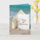 A blank card is elegantly set against a beach backdrop, accompanied by delicate white gypsophila flowers, a starfish, and a sand dollar for a 50th wedding anniversary.