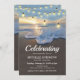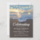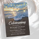 Funeral memorial invitations featuring a coastal shoreline, a beautiful sunset, string lights, and a modern celebration of life template that is easy to personalize.