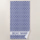 Ocean Blue and White Custom Boat Name beach towel with geometric pattern. Classic Ocean Blue and White Japanese SHIPPO pattern combined with modern minimal Boat Name typography. Personalised beach towels are beautiful patio and deck decor ideas and great gift ideas for her and him, sailors and boaters. #ybeedesign #ybeesea #bluebeachtowel #custombeachtowel #customblueandwhitebeachtowel Custom Boat Name beach towels made with ocean love © Design y.BEE SEA