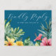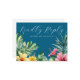 An elegant ocean blue watercolor tropical flowers and greenery RSVP card with elegant typography. The reverse features your details and a fun guest song request. Designed by Thisisnotme©
