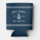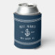 Upgrade your boat beverages with these cool personalised can coolers in bright navy blue. Design features your boat name, ship's registry, and year established in white lettering, accented with an anchor illustration and rope stripe detailing at the top and bottom.