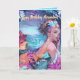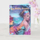 Watercolor mermaid in the sea birthday card. This watercolor design has lots of blue and pink. The background has ocean waves and a colourful sky. The mermaid is wearing her hair up with a headband of flowers. Dive into enchantment! Perfect for mermaid lovers. Brighten someone's day with this stunning card.