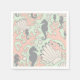Pastel coloured cocktail napkins with an ocean garden design of seahorses, corals, sea shells and bubbles. Light cucumber green, peachy orange, grey, and cream.