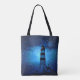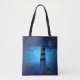Nautical and seascape theme. A lighthouse a stormy night with dark clouds and rain. A light can be seen in the lighthouse tower. A dark blue image covered with drops, raindrops or ocean spray