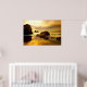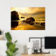 Featuring a breath taking view of a Orange sunset over top of the ocean and the waves hitting the shore of the Ocean And a large rock on the shore with the waves splashing up against it..this is a beautiful photo on this poster