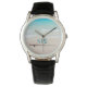 Monogrammed watch for men. Tropical turquoise ocean water and beach sand is the background image for a fishing pole and template for three initials. The watch face works for any style band. Lettering is grunge style in dark brown-red colour. A perfect gift for the saltwater fisherman.