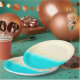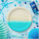 Ocean shore, teal water, sandy beach, paper plates perfect for a beach themed wedding or baby shower.