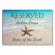 Wedding reception reserved seating cards in a beach theme. Beautiful blue ocean water with waves lapping the shore, is the image behind the black, custom text. Customise all three lines, with "reserved" text at the top, name beneath that, and title at the bottom. Reserve seats for members of the wedding party and special family members with these cards.
