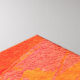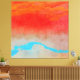 An abstract design of an ocean sunset with bold colours in red, orange, cyan, blue, and beige.