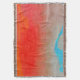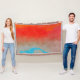 An abstract design of an ocean sunset with bold colours in red, orange, cyan, blue, and beige.
