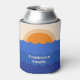 Beautiful elegant can cooler with minimalistic scene of ocean and setting sun. Personalise it with a name or text. This simple illustration captures the serene beauty of a sun setting at the ocean. The waves are simple curved lines, starting from the bottom of the illustration and extending upwards towards the horizon line. Different shades of rich blue add to the sea dynamics. The sun is a large circle glowing in a brilliant orange, dipping into ocean. The sun and the ocean waves evoke vintage vibes and create tranquil scene and elegant design.