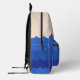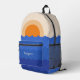 Beautiful elegant backpack with minimalistic scene of ocean and setting sun. Personalise it with a name or text. This simple illustration captures the serene beauty of a sun setting at the ocean. The waves are simple curved lines, starting from the bottom of the illustration and extending upwards towards the horizon line. Different shades of rich blue add to the sea dynamics. The sun is a large circle glowing in a brilliant orange, dipping into ocean. The sun and the ocean waves evoke vintage vibes and create tranquil scene and elegant design.