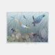 Watercolor painting of a woman swimming in the ocean with a turtle and seahorses.