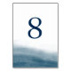 Coastal chic table number cards in shades of marine navy blue and white feature a watercolor wash at the bottom that evokes the ebb and flow of the tide, with your table number in matching navy. Design repeats on reverse side. Coordinates with our Ocean Tides wedding invitation suite.