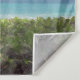 The original photograph by ZoeSPEAK on this Wall Tapestry is a view of the Atlantic ocean from the dunes above Juno beach, Florida. In the foreground at the top of the dunes is a row of sea grapes, with their disc-like yellow green leaves. The sky is blue with puffy white clouds over a marine and aqua blue sea.