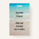 Ocean water and beach scene custom badge with two places for text. Include a name and more text beneath, or go into the customise area and change whatever you need to. Reverse has the same image without text.