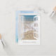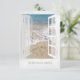 Beach hearts in sand with names in window view of ocean with frothy surf for wedding invitation.