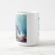 A oceanic themed coffee cup with a beautiful illustration of an impasto style whale swimming deep in the sea by vibrant colorful coral. A really beautiful coastal art. Colors used are teal, blue and soft coastal colors. On the back is a sweet coastal poem wishing someone a calm day.