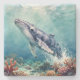A oceanic themed coaster with a beautiful illustration of an impasto style whale swimming deep in the sea by vibrant colorful coral. A really beautiful coastal art. Colors used are teal, blue and soft coastal colors. On the back is a sweet coastal poem wishing someone a calm day.