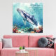 A oceanic themed wall art with a beautiful illustration of an impasto style whale swimming deep in the sea by vibrant colorful coral. A really beautiful coastal art. Colors used are teal, blue and soft coastal colors. A relaxing beachy poem for a calming day.