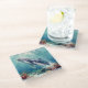 A oceanic themed coaster with a beautiful illustration of an impasto style whale swimming deep in the sea by vibrant colorful coral. A really beautiful coastal art. Colors used are teal, blue and soft coastal colors.
