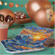 A paper plate with an illustration of a stained glass mosaic ocean waves and sunset illustration. These are perfect for a beach themed coastal birthday party.