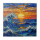 A tile with an illustration of a stained glass mosaic ocean waves and sunset illustration.