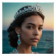 An ultra-realistic digital portrait of a young woman in three-quarter view, illuminated by dramatic warm and cool lighting. She wears an elaborate, ocean-inspired polished silver jewelry set adorned with turquoise, aquamarine, and moonstone clusters, including a tiara, long earrings, and a layered necklace. Her flowing teal gown harmonizes with the soft, blurred seaside twilight in the background, creating a serene and luxurious coastal elegance.
