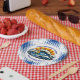 Boy's birthday party in a nautical or maritime theme paper plates. A pop art ocean wave in blue and orange. Add child's name in the personalize area.