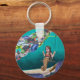 A keychain that features a nautical drawing of a school of large fish swimming past a mermaid on a swing.