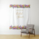 Fall bridal shower tapestry with elegant gold typography and autumn leaves. The design features borders of botanical foliage in fall colours of green orange gold and purple. It is lettered with "[name's] bridal shower and ready for you to personalise. Please browse my store in the October Leaves collection, for matching items.