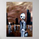 Bleak and weird. Pale bulbous headed hollow eyed Octopus Boy in his light grey suit and holding a briefcase.. Behind him are several others that look just like him.