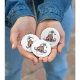 The front of the pin button offers a prominent area for customisable text. Personalise this cheerful accessory with: