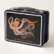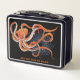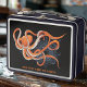 An orange octopus against a backdrop of black. Octopus tentacles in and around bubbles and a blue mandala