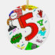 A design dedicated to the number 5! Ode to Five is inspired by the drawings junior high and high school students doodle on their notebooks and binders with pen and marker - and themed around the number 5! A big 5, a five dollar bill, a nickel, Beethoven's 5th, a hand, the French and Spanish words for 5, 5-card stud poker hand, and even James Madison - America's fifth president - all decorate this unique ornament. So celebrate the number 5 with this spectacularly fun design! Design was hand-sketched in pencil and pen and digitally coloured with marker-pen. Original design by Sunny. Copyright 2012