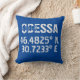 Modern throw pillow design features latitude and longitude coordinates for Odessa, Ukraine in distressed light grey font on blue background