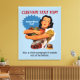 Woman wearing a ruffled apron holding glass jars of vegetables. Custom background colour. Top and bottom custom text. Customisable and removable burst bubble with custom text.