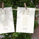 These lovely off white table seating card feature a lovely watercolor white ribbon and faux gold font. The design includes 10 guests per table, but design can allow for up to 12 guests max. The design is repeated at the back for easy visibility from all sides of the table. Add each sign with individual seating number to cart.