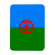 Official Romany gypsy traveller flag of green and blue representing the earth and sky with a red wagon wheel, representing travel.