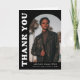 Stylish and trendy graduation thank you card featuring the graduate's photo on the front with an offset arch photo frame. "Thank You" is displayed in bold white retro lettering on a black background. Personalise the front of the arch photo graduation thank you card by adding the graduate's name, school, and graduation year. The inside of the card provides space for your typed or handwritten message. The back of the black graduation thank you card features a 3 photo collage.
