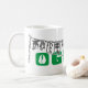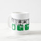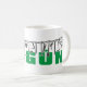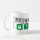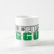Oggun mug with achaba. Name of Oggun in text with cowrie design. Printed colours green and grey.