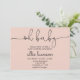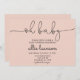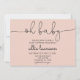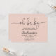 A simple and classy baby shower invitation. Black elegant script on a pale pink background.