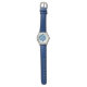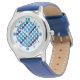 Diagonal rows hearts in shades of blue accent this fun wristwatch shown in a kids style but also fun for adults. Coordinating blue numbers on a white background make it easy to tell the time.