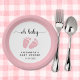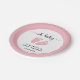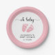 Cute paper plates for your baby girl shower featuring "oh baby" in a stylish script with swashes and a pink watercolor of baby feet. Personalise with your name and shower date.