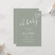 A modern minimalist all-in-one baby shower invitation featuring a cute hand-drawn heart, registry QR code, and event details set with stylish typography on a sage green background. Designed by Thisisnotme©