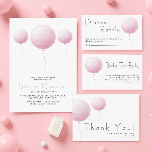 Celebrate the arrival of your baby girl with this soft pink balloon baby shower invitation. The minimalist design features elegant pastel tones and a floating balloon illustration that adds a sweet, modern touch. Perfect for welcoming your little one in style. Easy to customize with your event details.