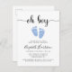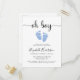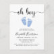 Cute and minimal baby boy sprinkle postcard invitation with "oh boy" in a stylish script with swashes and a pastel blue watercolor of baby feet. Easily personalise the baby sprinkle details.