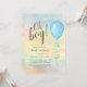 This cute boy's Baby Shower Invitation is decorated with a watercolor blue balloon and green eucalyptus on a colourful sky background and says "Oh Boy!"