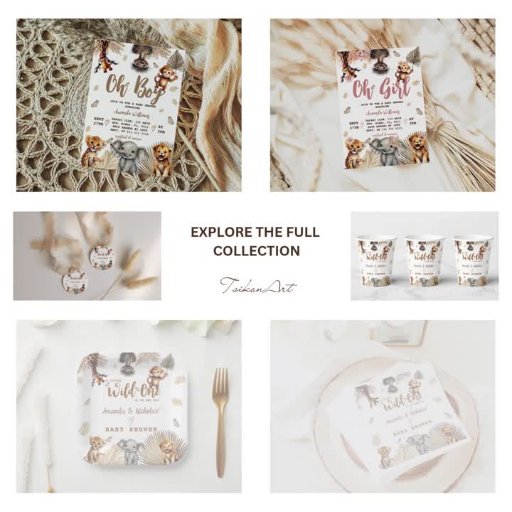 Join us for a charming boho baby boy shower with a safari theme! Our adorable invitation features playful baby animals including a monkey, giraffe, ostrich, lion, elephant, and tiger, all set against a beautiful backdrop of pampas and palm leaves. Delicate script and intricate details make this design truly one-of-a-kind.