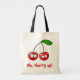 Two red cherries topped with a green leaf. One looks gloomy and the other one says: "Oh, cherry up!" An amusing pun on "cheer up". Eco-friendly tote bag. Pick style and colours. You can remove or change text. Also available in keychains, buttons, stickers, stationery.
